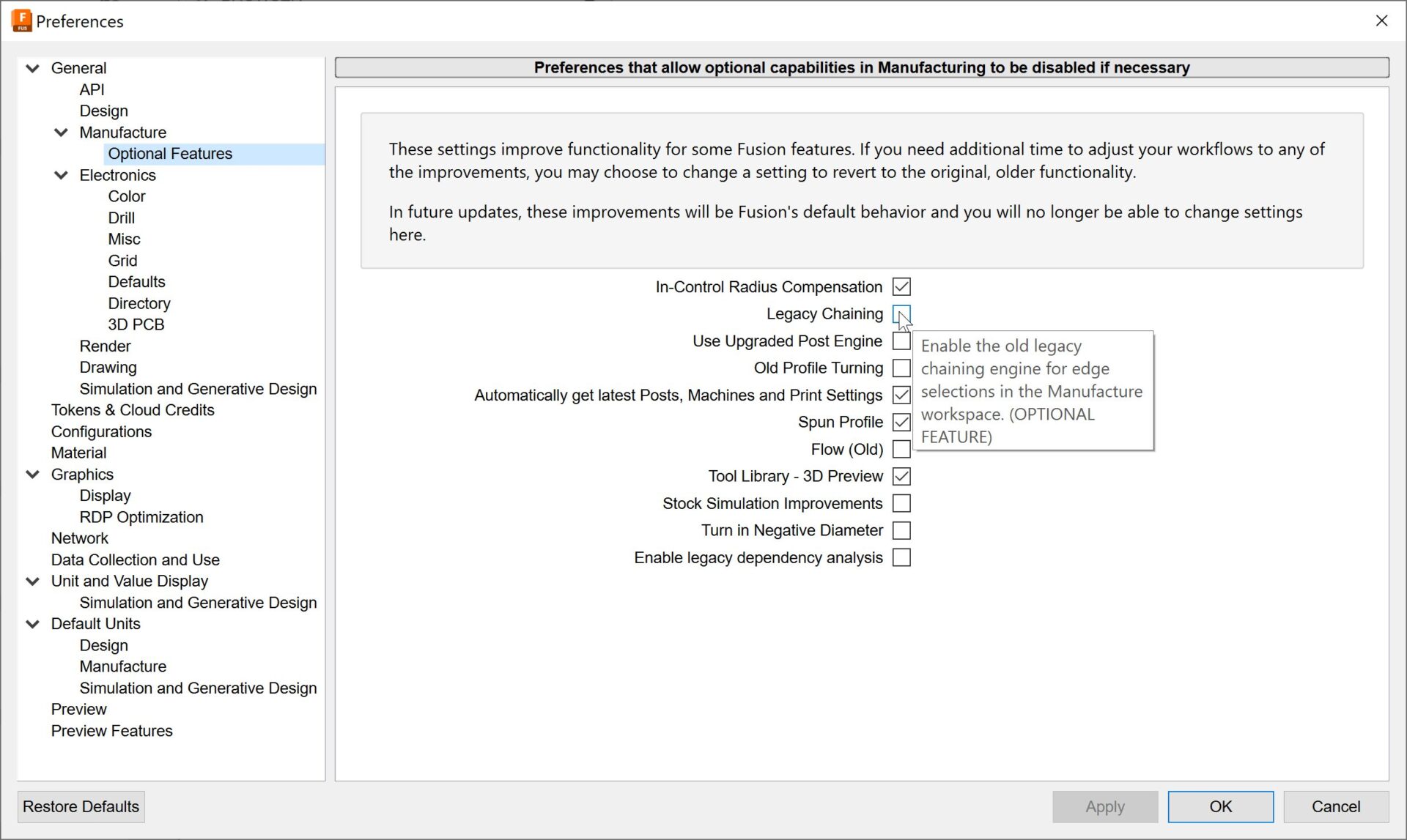 The functionality is fully released as part of this January update and will replace the current implementation. In the event of unforeseen problems, it will be possible to revert to the ‘legacy’ chaining through the Preferences>Manufacture>Optional Features dialog.