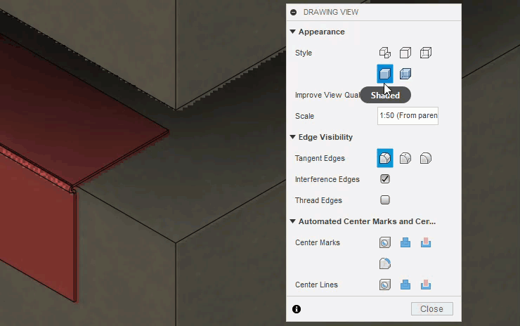 Models with a mix of long thin and thick parts can have shaded views that are a bit tessellated when zooming in. An example could be a thin sheet metal component bolted to a thick concrete slab. This new feature improves the appearance of these shaded. The shaded view is sharper, but the file size increases, and may result in a slightly slower performance.