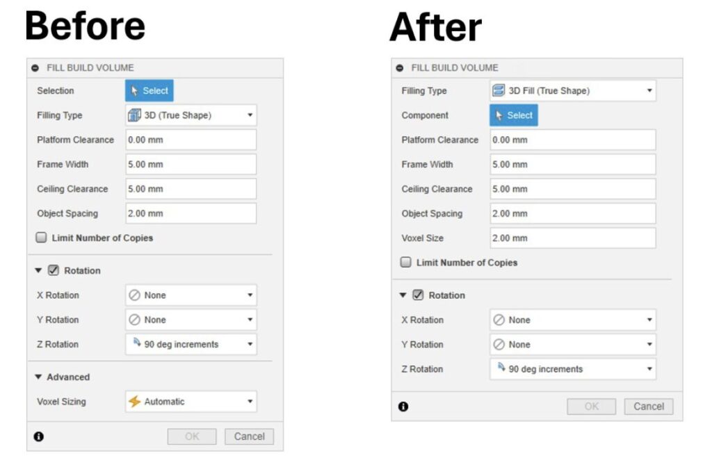 We also updated the name of certain parameters, and the user interface options of the Additive Arrange and Fill Build Volume dialogs. These changes were made to improve the consistency between the two dialogs. The most notable update impacts the “Voxel Sizing” setting within the “Fill Build Volume” dialog. This setting is no longer a drop-down menu within the “Advanced” section of the dialog. It is now a numerical input field and is relocated within the dialog to be below the “Object Spacing” input field. The default value for “Voxel size” is set to 2 mm, as this value offers a good balance between calculation performance and object spacing result accuracy.