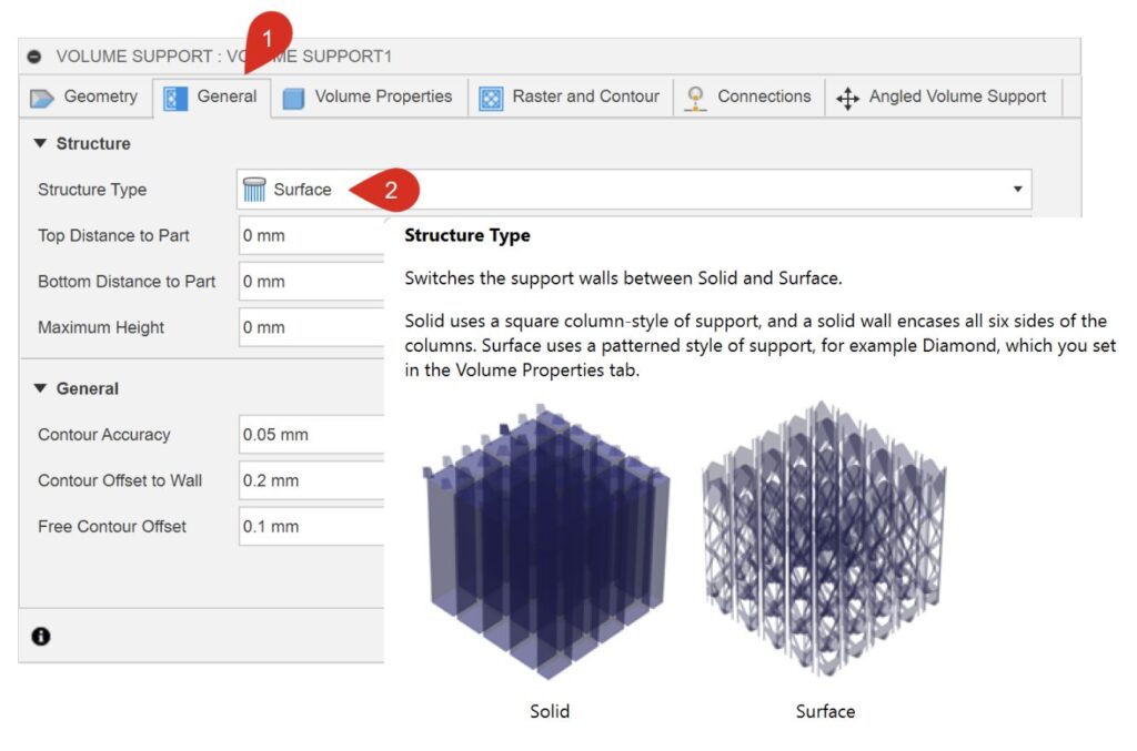 Continuing with the user interface updates, we have renamed and repositioned some of the support structure settings. These changes can be seen in Metal Powder Bed Fusion additive setups, when using Volume or Polyline supports. The main change is to the “Structure Type” for the Volume supports, and the “Polyline Type” for the Polyline supports. Both now use “Surface” and “Solid” instead of “Structured” and “Closed Volume”. The icons have also been updated.