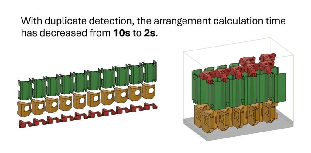 We also significantly increased the performance of the True Shape arrangement type for certain workflows. True Shape arrangement type can now detect duplicates of a given component ahead of performing the part arrangement calculations. This means that True Shape algorithm can arrange parts quickly and efficiently regardless of whether you create your duplicates before packing your parts or during the packing operation.