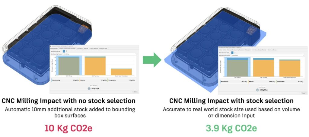 We’ve heard your feedback about the default assumptions for stock material dimensions not always matching real-world practices. Previously, MSI added a standard buffer around the part geometry, which wasn’t always accurate. Now, you can define your own stock dimensions for CNC machining, CNC turning, and even metal additive manufacturing. This means more precise material usage calculations and less waste!