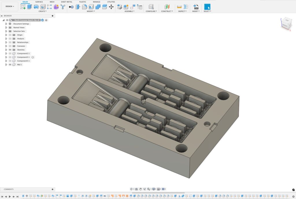 Limpi used Fusion to design and manufacture custom aluminum molds for injection and casting—each one improving their understanding of radii, draft angles, and plastic flow. “You have to try it out, put the mold back in the machine, try it out again, make some changes—every part we made was a new learning curve,” Lammering says. Limpi advanced from 2D engravings to fully 3D designs, introducing complex forms, smooth patterns, and precise fit for injection molds while giving their recycled products new depth and polish.