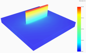 - A set of thermal simulations for a wall shape are completed directly modeling the powder for materials of varying thermal conductivities. The materials tested were AlSi10Mg, Copper, Gold, Inconel 718, Platinum, pure Titanium, and Ti-6Al-4V. The test geometry may be seen in Figure 2.