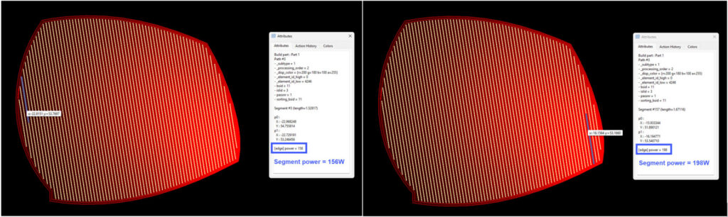 To apply the results of laser power optimization to laser path generation and create a build file, we used a project developed specifically for this purpose in Netfabb’s Advanced Toolpath Utility (ATU). Using voxel-based power scaling data, each generated exposure path segment is assigned a power value within the acceptable range (30% from the nominal value).