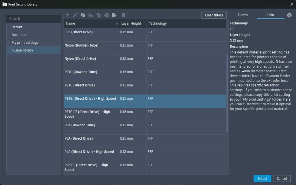 Fusion supports a wide array of materials, including ABS, CPE, Nylon, PETG, PLA, PLA carbon fiber, TPU, PVA, and some metal based filament. We also have specific print settings for direct drive and Bowden tube printers. For those unfamiliar, direct drive printers house the filament gear within the print head, while Bowden tube printers separate the filament gear from the print head and use a Bowden tube to guide the filament. Additionally, for high-speed printing, we include settings to accommodate printers such as the Bambu Lab series. These print settings contain “–high speed” in their name.