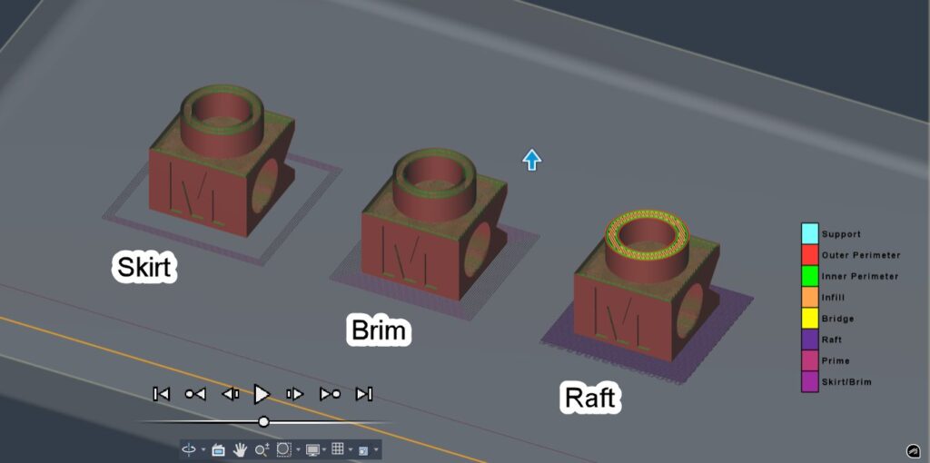 Proper adhesion to the print bed is crucial, and Fusion offers a selection of adhesion options including skirts, brims, and rafts. These methods aid in improving the part’s ability to stick to the print bed, enhancing the overall print quality and consistency. A brim adds printed loops around the part to increase the surface area in contact with the print bed. Users are able to choose as many or little loops as they want. A skirt is very similar to a brim, except that it is detached from the part and acts as a nozzle priming operation. A raft is when multiple layers of filament is deposited down before the part to provide a platform on the print bed for the part to be printed onto. This can simply be removed by hand once printing has finished.