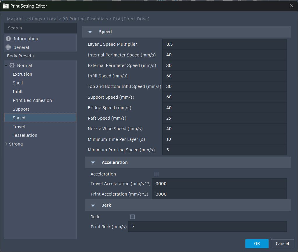 In Fusion, users have full control over their print speeds, with customization options for each toolpath type. Users are also able to adjust the jerk and acceleration settings, which can all be found in the Speed tab of the print settings, allowing precise adjustments for optimal print quality and efficiency.