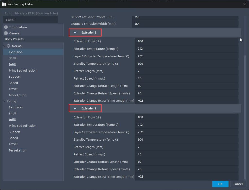 If your printer supports multiple extruders, Fusion enables you to utilize this capability to its fullest extent. In the Extrusion tab of the print settings, users are able to configure their settings on a per-extruder basis.