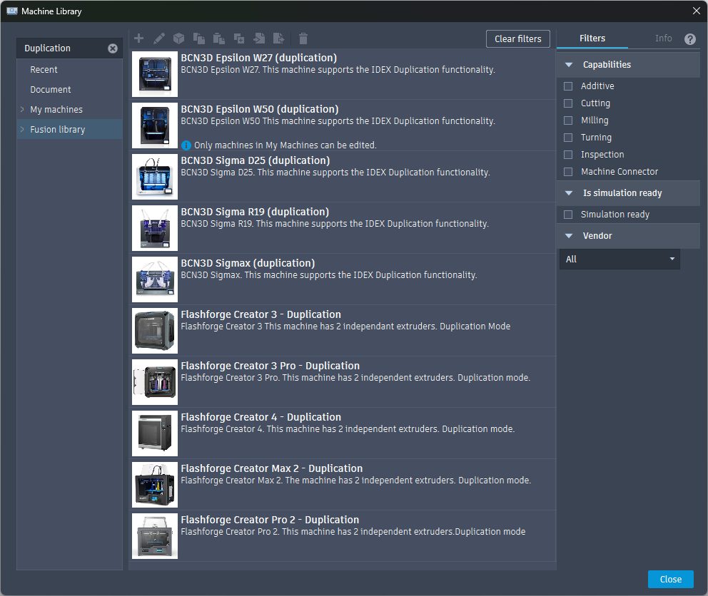 For specific printers equipped with Independent Extruder heads, Fusion supports functionalities like duplication and mirroring. This allows the simultaneous printing of two identical parts, effectively doubling productivity compared to conventional printers. To use this functionality, simply select a machine with “Duplication” or “Mirror” in its name from the machine library, and create your print file as you usually would. The duplication and mirroring functionality is handled automatically.