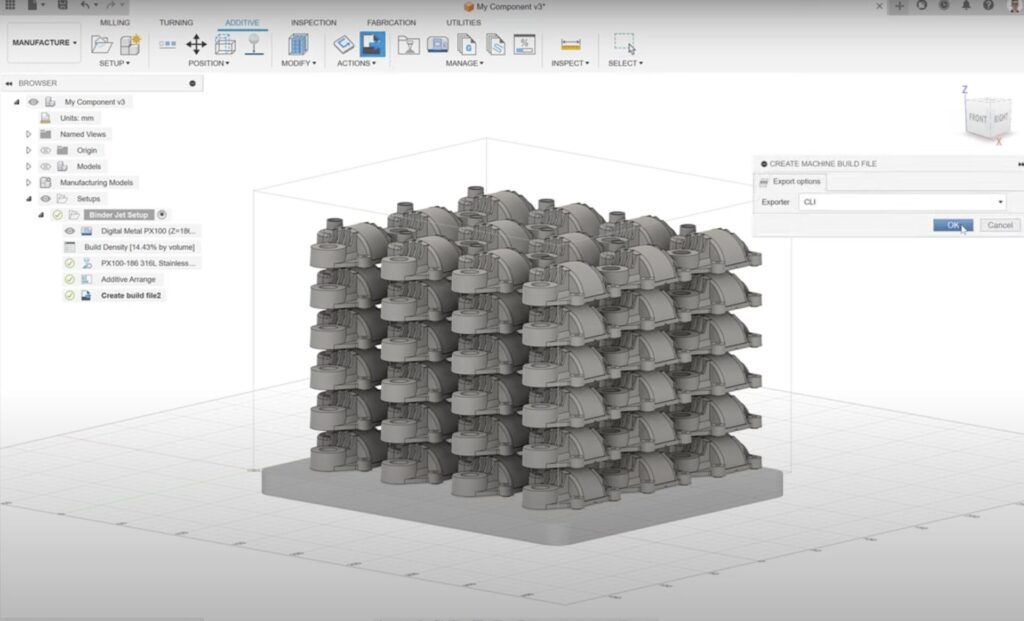 If you’re looking to send your model to a Markforged binder jet printer, head back to the Markforged group in your Design Workspace ribbon and select “Create Markforged Metal Binder Jet Setup”. Subsequently, once the binder jet setup is created, generate your machine build file and upload it to your machine.