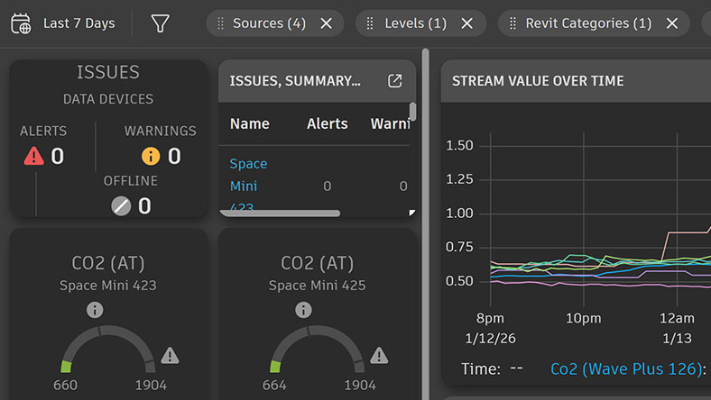 Set up individual or batch-imported streams that receive and store time-series data from building sensors, with each stream acting as a tagged asset that can be mapped to facility parameters.