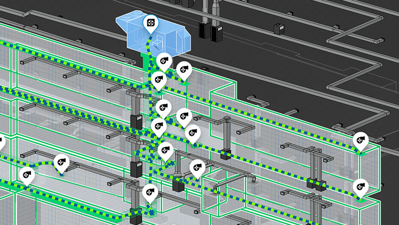 Create a traceable network of building systems. Combine and utilize 3D BIM models with automation to mirror a building’s distribution systems and visualize networks. Move upstream or downstream through a system to see connected assets and understand the spaces they serve.