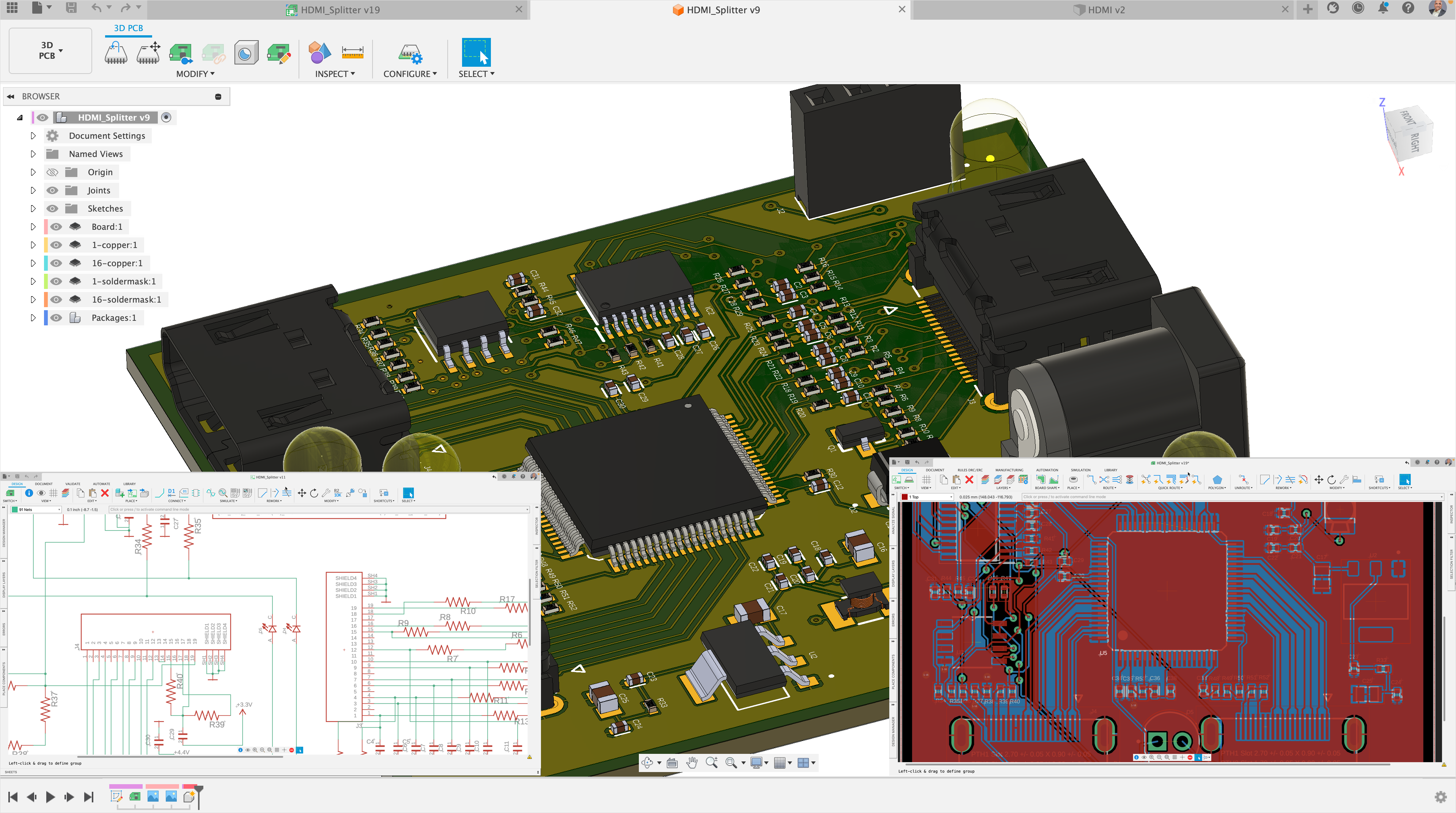 Autodesk Fusion maintains relationships and manages dependencies with unprecedented synchronization and the timeline/history core to Fusion. Using tools like edit-in place, PCB parts can be moved within a complex hierarchy of assemblies and subassemblies, and changes can propagate in real-time with the click of a mouse. Â