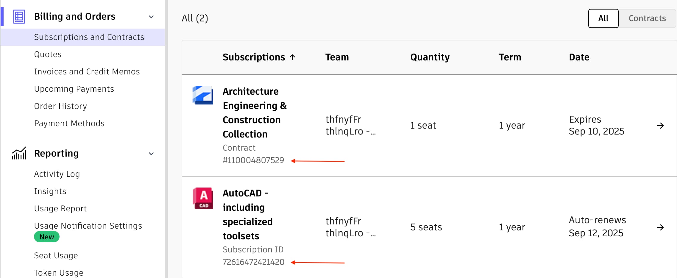 To see whether your subscription has a contract number or subscription ID, go to Billing and Orders > Subscriptions and Contracts in your Autodesk account.