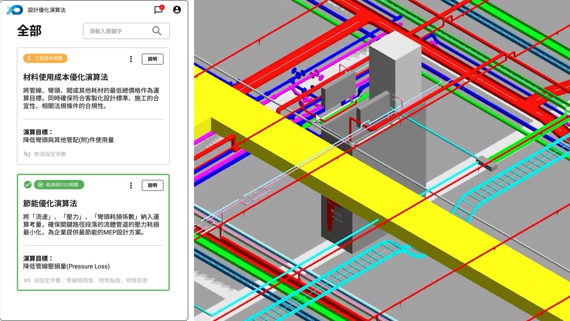 此外,系統還提供 3 種演算法讓設計團隊選擇,包括能讓機電管線配管路徑優化的最短路徑演算法、降低彎頭等高單價耗材使用量的材料使用成本優化演算法,以及將流速、壓力納入運算以確保管道壓力損耗最小化的節能優化演算法等。