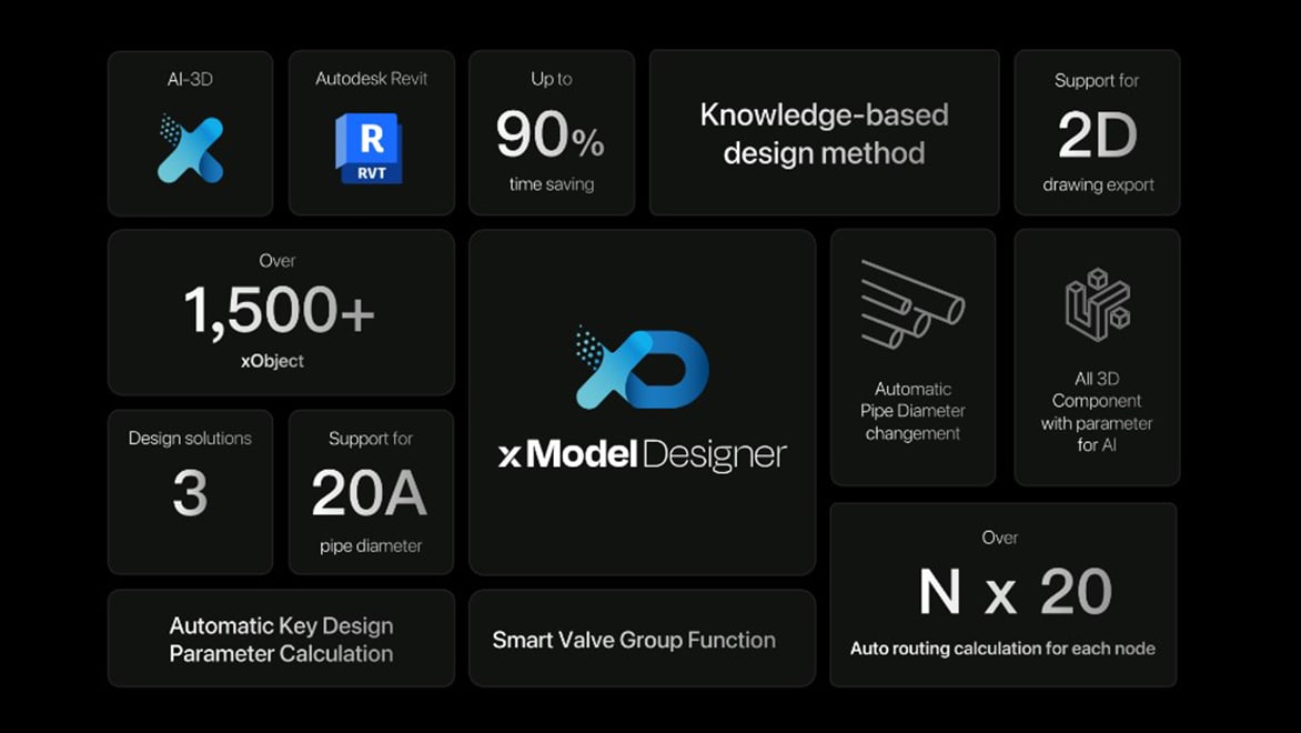 xModel Designer 是建構在 Autodesk Revit 平台上,利用演算法與深度學習技術,搭配知識與經驗資料庫數據萃取,可高效地進行複雜的機電管線系統自動化 3D 設計及建模。xModel Designer 除了與 BIM 相同,具備視覺化、資訊承載能力之外,更具有衝突排解、自我認知能力,它能直接在空曠場域虛擬環境中生成最佳化的設計方案,並排解掉所有衝突,在進行 3D 設計的同時也產生 3D 建模,因而避免了傳統 BIM 流程中的手動建模和衝突排解的繁瑣流程,大幅提高了設計效率和準確性。